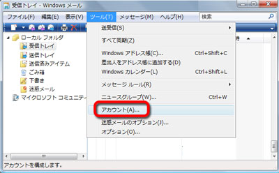 「ツール」メニューから「アカウント」を選択します。 |