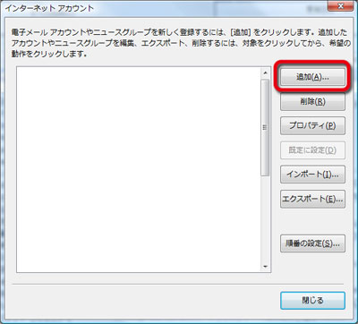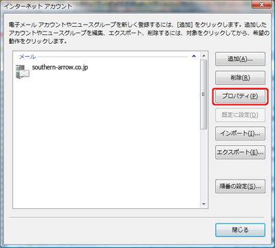 開いたウィンドウより、メールの設定変更を 行います。 設定したいアカウントが選択 されていることを確認して、「プロパティ」 ボタンをクリックします。 |