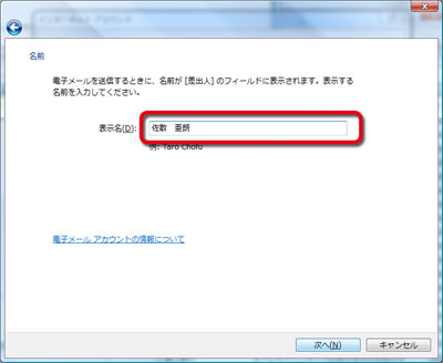 「表示名」テキストボックスに、送信するメールの差出人に表示させる名前を入力します。(お好みの名前でかまいません。 |