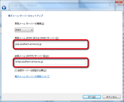 電子メールサーバーの種類は「POP3」を選択します。 |