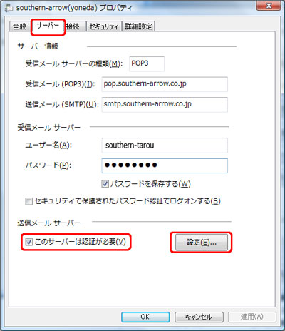 「サーバー」タブをクリックします。 「このサーバーは認証が必要」に チェックをいれ、 「設定」ボタンをクリックします。 |