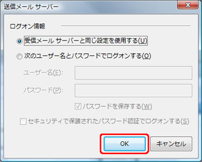 「受信メールサーバーと同じ設定を使用する」が選択されていることを確認して「OK」ボタンをクリックします。 |