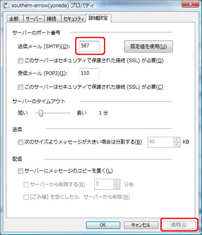 「詳細設定」タブをクリックします。 送信メール(SMTP)に「587」と 入力します。 「適用」ボタンをクリックして 最後に「OK」ボタンで設定終了です。 |